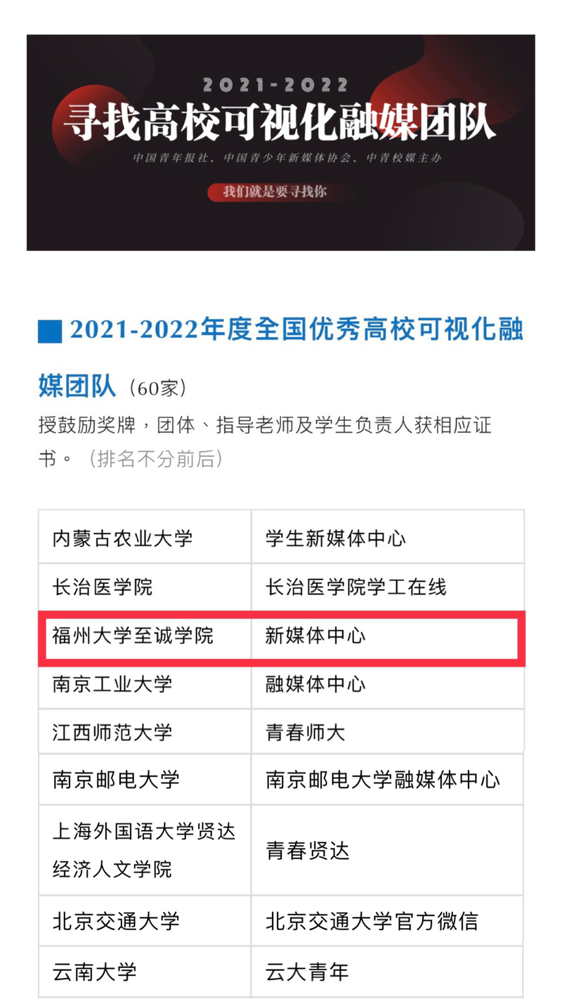 近日,在由中国青年报社、中国青少年新媒体协会和中青校媒共同主办的“2021-2022高校可视化新闻激励计划·寻找高校可视化融媒团队”评选活动中,足球完场比分 团委新媒体中心荣获“2021-2022年度全国优秀高校可视化融媒团队”称号,这是新媒体中心继获全国百强校园媒体后再添新殊荣。