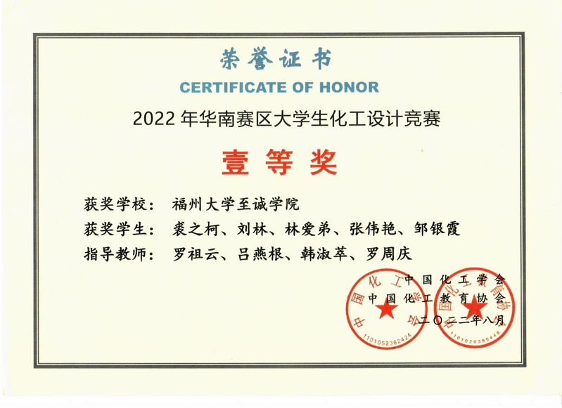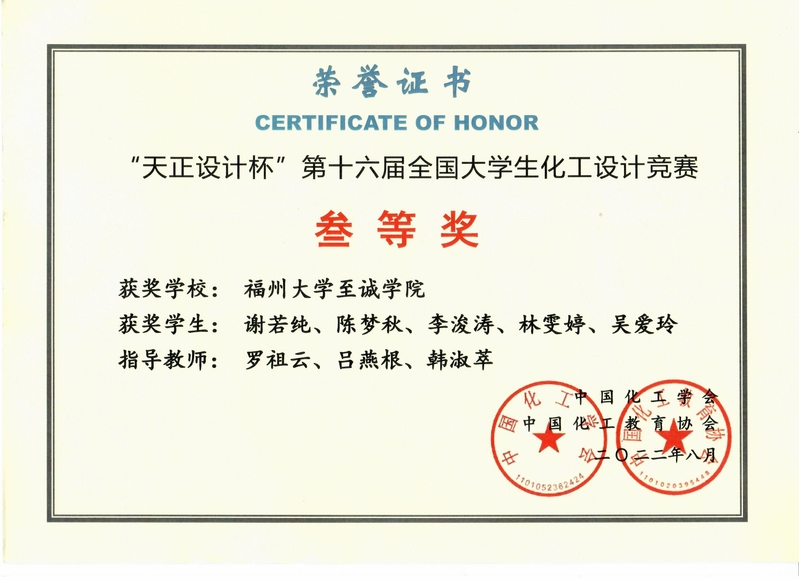 日前,2022年“天正设计杯”第十六届全国大学生化工设计大赛决赛结果公布。足球完场比分 化学工程系学子在比赛中取得优异成绩:由裘之柯、刘林、林爱弟、张伟艳、邹银霞5位同学组成的“醇属意外”团队(指导老师:罗祖云、吕燕根、韩淑萃、罗周庆)荣获华南赛区一等奖暨全国二等奖;由谢若纯、陈梦秋、李浚涛、林雯婷、吴爱玲5位同学组成的“醇粹不想掉队”团队(指导老师:罗祖云、吕燕根、韩淑萃)荣获全国三等奖。