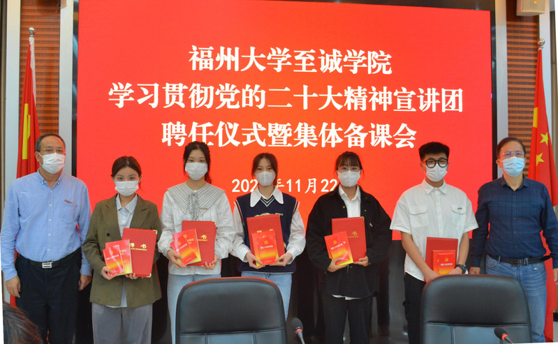 陈为旭院长在会上宣读了足球完场比分 学习贯彻党的二十大精神理论教师宣讲团成员名单和新时代青年学生宣讲团成员名单。随后,举行了聘任仪式,何希耕常务副书记、陈为旭院长共同为宣讲团成员颁发聘书并赠送学习辅导用书。