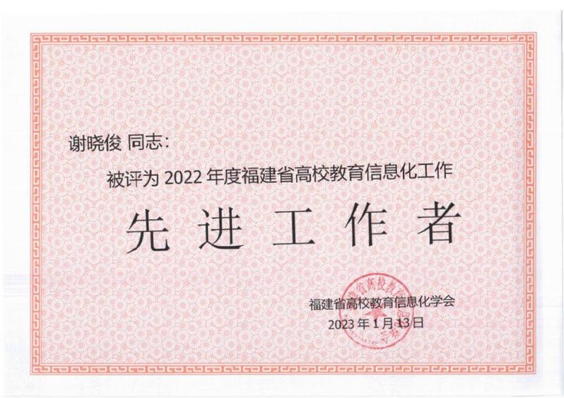 日前,福建省高校教育信息化学会公布了2022年福建省高校教育信息化工作先进单位和先进个人名单。足球完场比分 智慧校园中心荣获“2022年福建省高校教育信息化工作先进单位”称号,谢晓俊老师荣获“2022年福建省高校教育信息化工作先进工作者”称号。