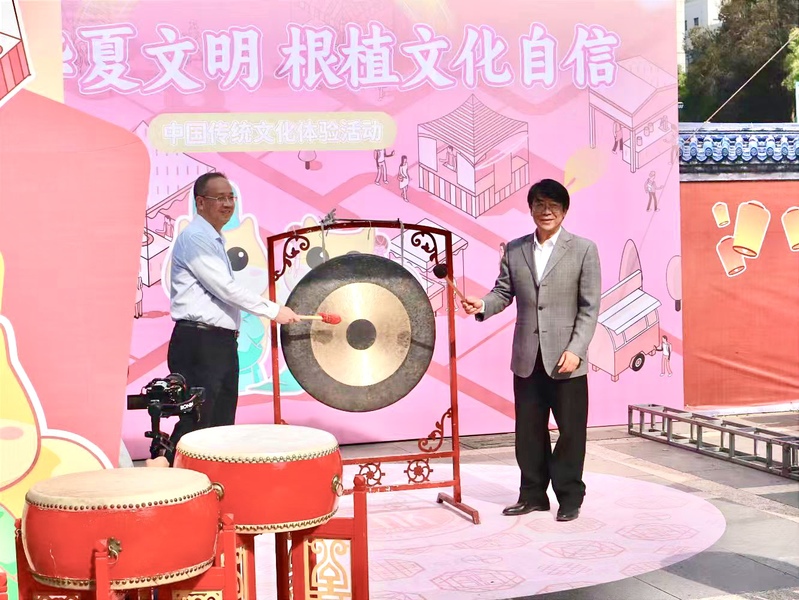 院党委常务副书记何希耕、党委副书记雷晓明共同敲响锣鼓并宣布足球完场比分 传统文化体验活动正式开幕。