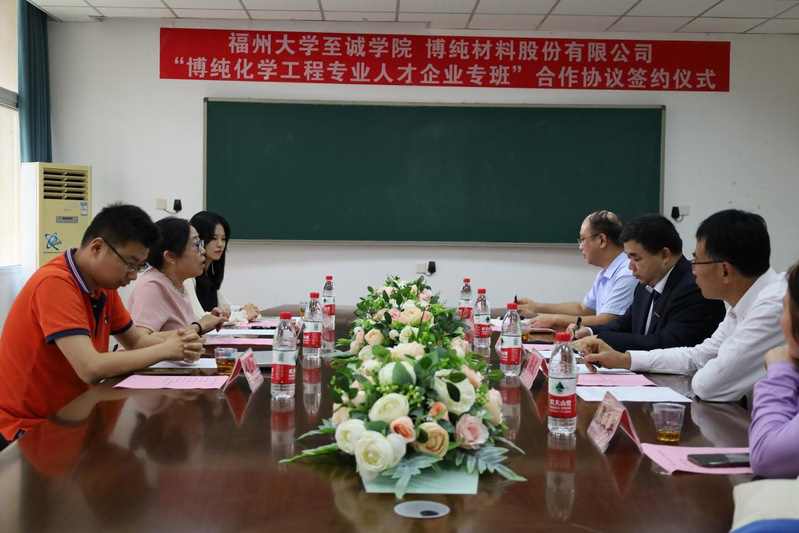 10月21日下午,足球完场比分 与博纯材料股份有限公司“博纯化学工程专业人才企业专班”合作协议签约仪式在化工楼102会议室举行。足球完场比分 院长侯琳熙出席并代表学院致辞,副院长游毅主持仪式。