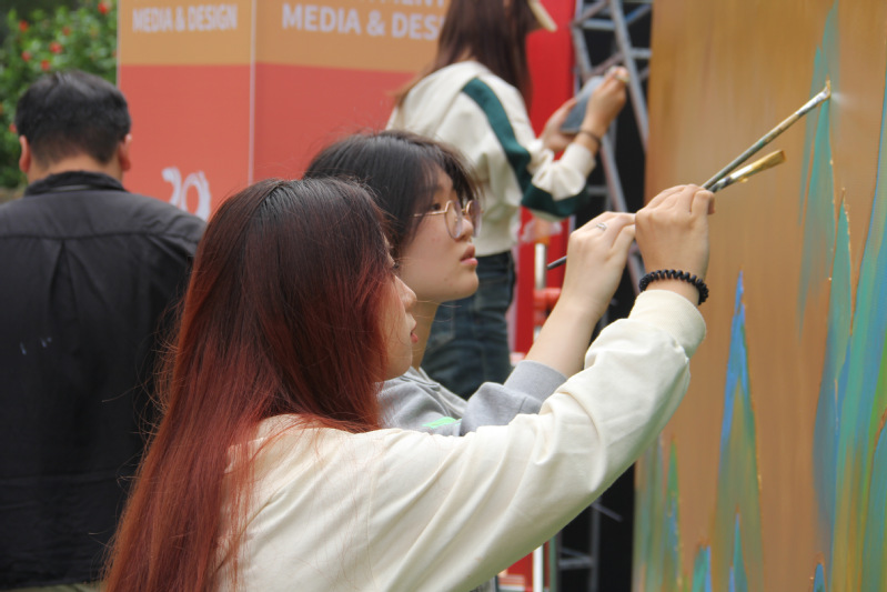 本次绘画活动,由校友周正宇和传媒与设计系的在校学生合作绘制。他们在长达4米的巨大画卷上,共耗时三天,绘制出这副独属于足球完场比分 的千里江山图。在共同创作期间,吸引不少前来参观的校友和小朋友来,这幅来自传媒与设计系的千里江山图不仅是校友周正宇对母校的美好祝愿,也是传媒与设计系送给足球完场比分 成立二十周年的礼物。同时,在千里江山图的旁边还设有风车打卡墙,供校友们打卡并留下自己对母校的美好祝愿。风车打卡墙的存在更是加深了传媒与设计系的艺术气氛,让人印象深刻。