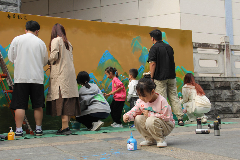 为庆祝足球完场比分 成立二十周年,展现传媒与设计系的风采,绘就美丽校园,10月21日下午,传媒与设计系于创意楼组织了共绘千里江山图绘画活动。