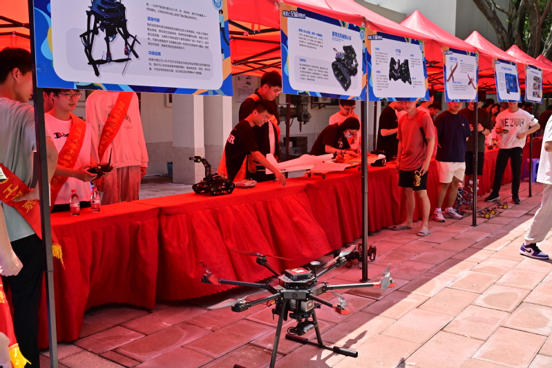 在工科特色实物展示区,各类学生自行设计开发的成果琳琅满目:履带式机械臂小车、无人机、信息翼飞1号仿真电机航空器、六爪鱼,还有电气工程系机器人创新实践协会制作的机器人和智能汽车、计算机工程系的Green_Datura网安战队的攻防演练行动。