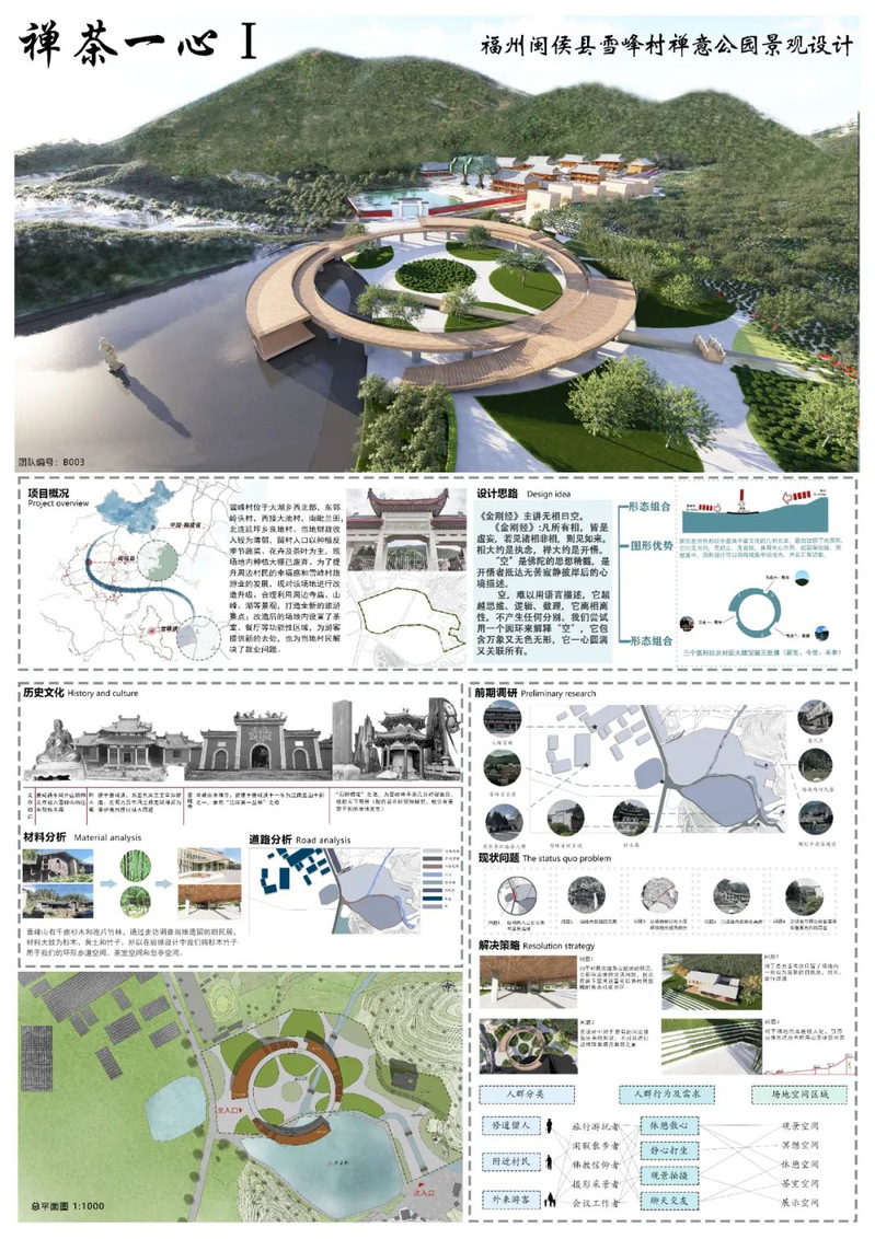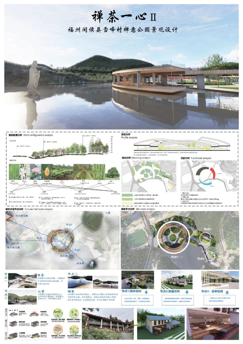 “禅茶一心”项目位于福建省福州市闽侯县大湖乡雪峰村,是一个禅意公园景观设计。作品结合场地雪峰二十四景、周围茶园景观和两汪池水,筛选出场地中最突出的寺景、湖景、山景三个视角景观,主体以三段孤的圆环形态轻架在场地,并改造民居为梯田茶室,设置息亭空间等。功能上,圆环顶层观景静心,圆环首层置入餐吧、集市、社区之功能。花化彩化方面,选取当地最有特色植物茶树、地涌金莲等做主要植物,并搭配各种寺院植物以及毛竹形成公园景观。