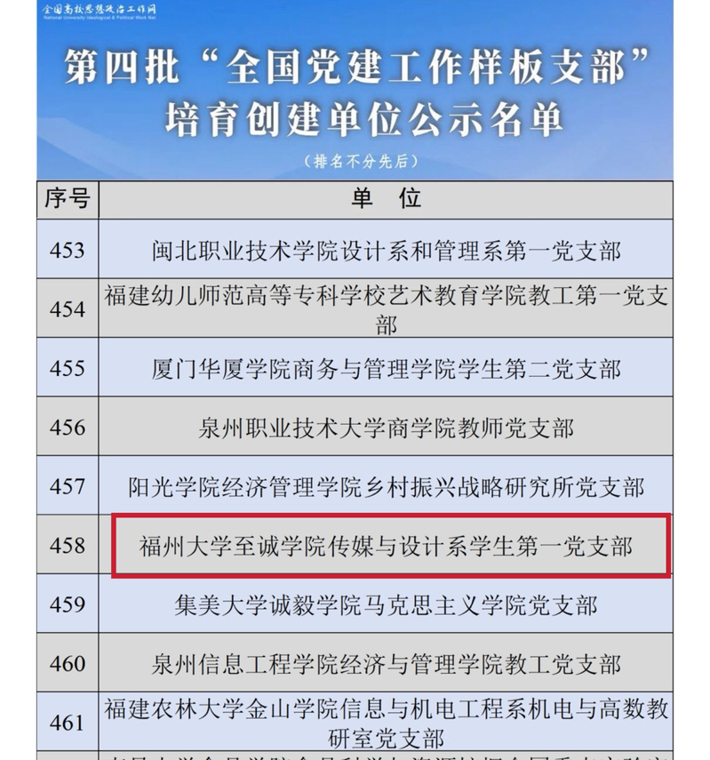 日前,教育部公示了第四批新时代高校党建示范创建和质量创优工作遴选结果,足球完场比分 传媒与设计系学生第一党支部入选“全国党建工作样板支部”培育创建单位。这是我院获批的第三个全国党建工作样板党支部。