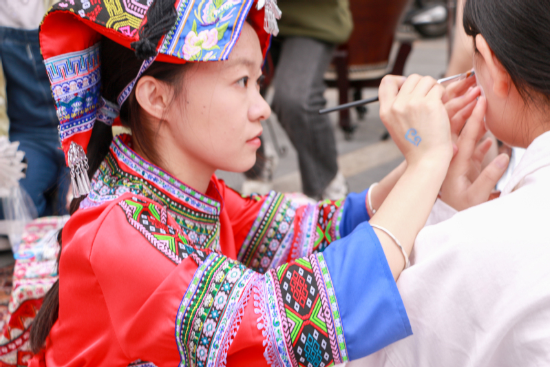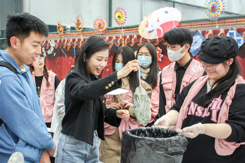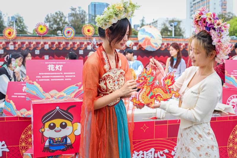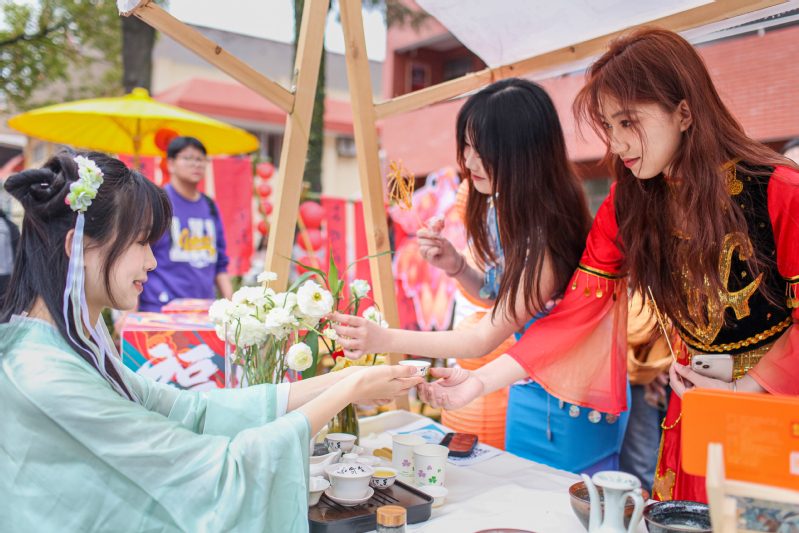 现场设有形式多样的活动体验区,师生徜徉其中,切身感受少数民族特色文化,体会别样风土人情。银饰、团扇、漆珠等琳琅满目的物品以及各色民族美食,展现着各民族文化深厚底蕴。在民俗体验区,哈尼族的“跳竹竿”、汉族的“扎染”、藏族的“巴珠”、泉州蟳埔村的“簪花”等非遗文化及民族特色互动体验激发了师生对民族文化的浓厚兴趣。