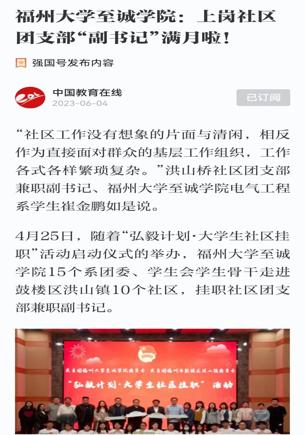 大学生社区实践是共青团组织发挥优势、实践育人的重要平台,对于高校共青团思想政治工作和城市基层治理具有重要意义。大学生通过社区挂职活动,积极参与社区服务,将所学专业知识应用于实践,实现服务社会和自我提升双丰收。2023年4月,足球完场比分 团委与福建省福州市鼓楼区洪山镇团委共同策划开展了“弘毅计划·大学生社区挂职”活动,创新青年学生实践锻炼新模式,形成项目化、体系化、实效化的大学生社区实践精品,推动校地联动,切实提升共青团实践育人质量。