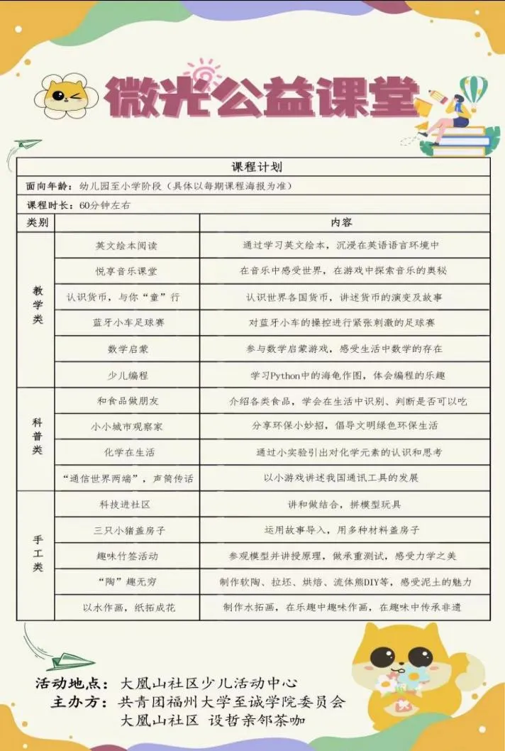 团委牵头,联合15个系团委,基于专业特色,自主设计并制定了“微光公益课堂”的课程计划。通过课程教案撰写、人员内容确定、团委审核,确保课程内容的专业性和适宜性。与大凰山社区深入沟通,结合社区需求,制定并完善了学期课程表。在实施过程中,社区积极组织宣传,居民线上自主报名参与,由志愿者担任教学,学院团委不仅提供经费、宣传、后勤等全方位支持,还全程监督课程实施,确保教学质量,并根据反馈及时调整课程内容和方法。