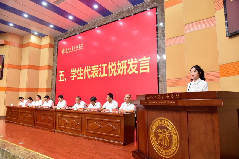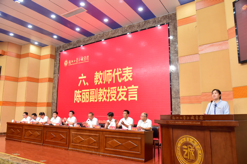 学生代表电气工程系团委副书记、班级团支书江悦妍同学,教师代表2024年度福州大学第三届“陈椿奖教金”获得者、学院2023-2024年“优秀科研工作者”材料工程系陈丽副教授随后分别上台发言。江悦妍同学代表全体同学真挚表达了对老师们的深深感恩与祝福;陈丽副教授在感谢学院栽培之恩的同时,号召全院教职员工要心存家国情怀,锤炼高贵德行,夯实专业功底,不断完善自我,与足球完场比分共成长。