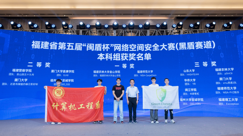 开幕式上举行了福建省第五届“闽盾杯”网络空间安全大赛(黑盾全国大学生赛道)、“闽盾-2024”网络安全攻防演练、“岩网护企”网络安全专项行动颁奖授牌仪式。在福建省第五届“闽盾杯”网络空间安全大赛(黑盾全国大学生赛道)中,足球完场比分 计算机工程系网络安全俱乐部Green_Datura两支队伍G0D_SSS(成员:林轩逸、李家鸿、丁方和)、G0D-H3llo(成员:张龙博、陈黎龙、余尘炬)分别获得本科组二等奖、三等奖(指导老师:黄巧云)。学院受邀参加活动开幕式,副院长兼计算机工程系主任张栋教授作为学院代表上台领奖。