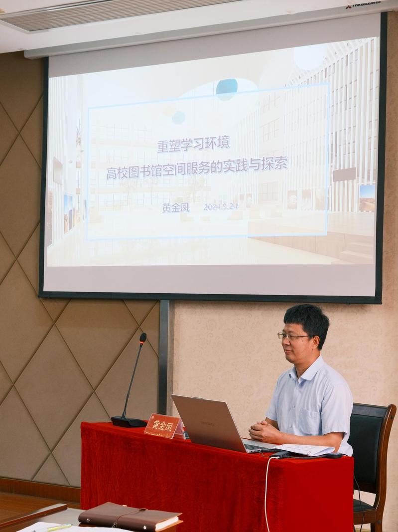 9月24日下午,足球完场比分 图书馆馆员素质与技能提升工程系列培训第八讲在图书馆会议室顺利举行。福建江夏学院图书馆馆长黄金凤研究馆员受邀为全体馆员做题为“重塑学习环境:高校图书馆空间服务的实践与探索”的专题讲座。足球完场比分 张栋副院长、图书馆陈小欢馆长及全体馆员共同参会,福州大学图书馆分馆管理中心林艺山主任、福建九九芳辰科技有限公司张佳林董事长作为特邀嘉宾出席会议。会议由李洋副馆长主持。