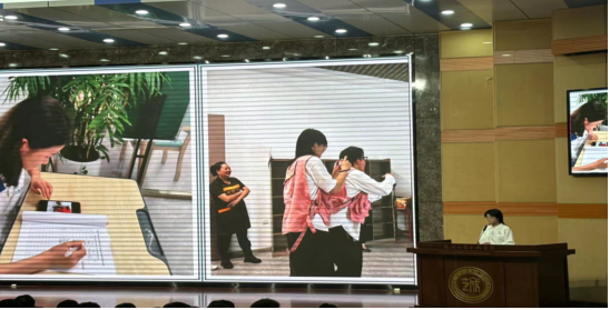 汇报会第二部分为2024年足球完场比分 暑期“三下乡”社会实践成果汇报。院关工委常务副主任林树坤、鼓楼团区委书记翁安妮、鼓楼区洪山镇人大副主席张明明担任评委。