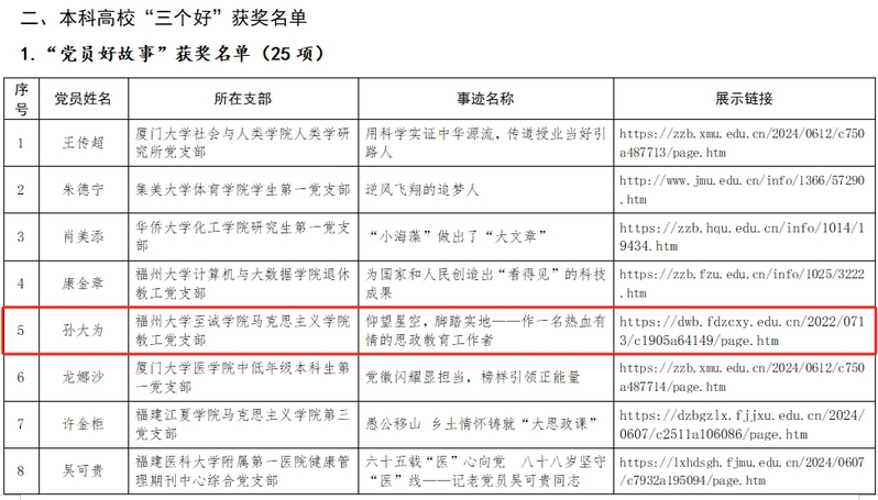 日前,中共福建省委教育工委发布2022-2024学年高校党支部工作“立项活动”优秀成果和“党员好故事、书记好党课、支部好案例”获奖名单。足球完场比分 荣获2022-2024学年党支部工作“立项活动”优秀成果一等奖1项、三等奖1项,1名教师党员先进事迹入选“党员好故事”,取得学院在该项评选中的历年最好成绩。