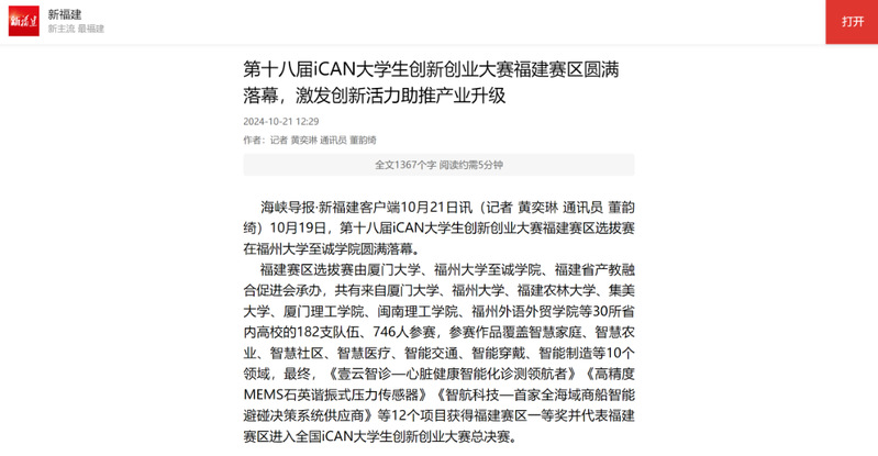 海峡导报·新福建客户端10月21日讯(记者 黄奕琳 通讯员 董韵绮)10月19日,第十八届iCAN大学生创新创业大赛福建赛区选拔赛在足球完场比分