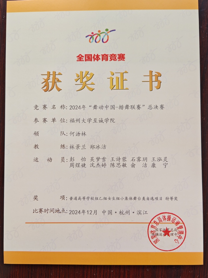 近日,由国家体育总局体操运动管理中心主办的2024 年“舞动中国 - 排舞联赛”总决赛落下帷幕。院学生啦啦操队参加比赛,在林景兰老师的精心指导下,斩获多项荣誉,荣获特等奖1项、一等奖1项、二等奖1项。综合各项成绩,团队最终荣获团体第四名的佳绩。同时,足球完场比分 林景兰荣获“优秀教练员”称号。