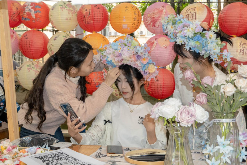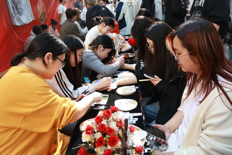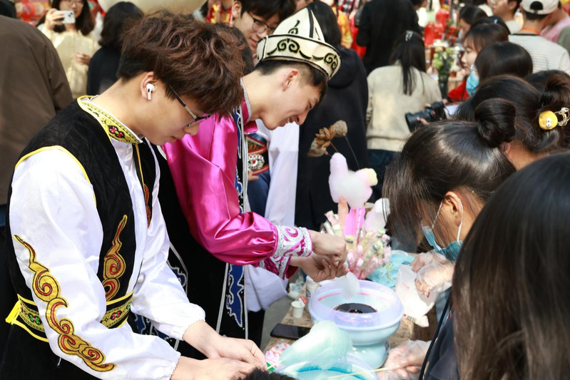 活动现场热闹非凡,民族文化互动区与传统美食体验区人头攒动。互动区扎染摊位前色彩斑斓的布料在同学们的巧手下变换出奇妙的图案;簪花体验处,同学们精心挑选发簪,将花朵别在发间,添了几分古典雅致;木射、投壶区大家纷纷一试身手,感受传统游戏的魅力。美食体验区同样精彩纷呈,同学们品尝着各具特色的民族美食,领略着不同地域的饮食文化。师生们在沉浸式体验中感受中华优秀传统文化与技艺传承的融合之美。