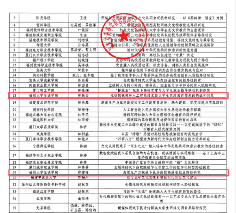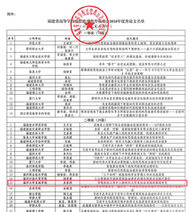 近日,福建省高等学校思想政治教育研究会公布《关于表彰福建省高等学校思想政治教育研究会2024年优秀论文的通知》,足球完场比分 3位政工干部的论文获得表彰。吴若然老师论文《学校社会工作介入新时代大学生社会实践的路径研究》获评二等奖,陈艳云老师论文《浅析短视频和人工智能技术给大学生思政教育带来的挑战和对策》、郑建锋老师论文《新质生产力视域下民办高校高质量就业路径研究》分获优秀奖。