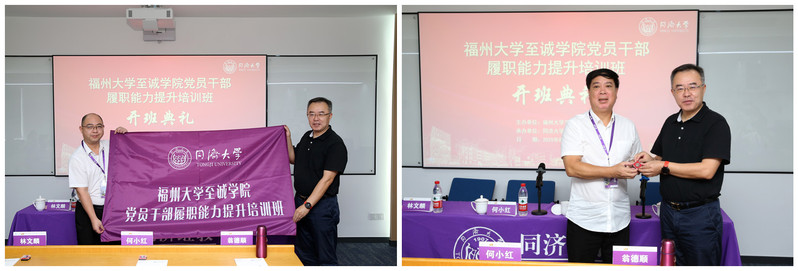 同济大学继续教育学院院长金福安为学员代表授同济大学校徽与班旗