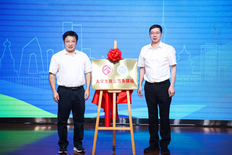 团省委副书记张阿峰与福州大学党委常委、副校长江莉龙为足球完场比分 “大学生就业服务驿站”揭牌