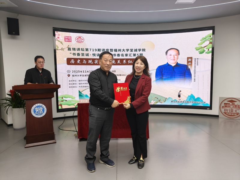 讲座现场,福州大学图书馆馆长林林为谢必震教授颁发嘉锡讲坛荣誉证书,院党委常务副书记何小红为其颁发“书香足球完场比分·悦读汇”之“书香名家汇”主讲嘉宾证书。