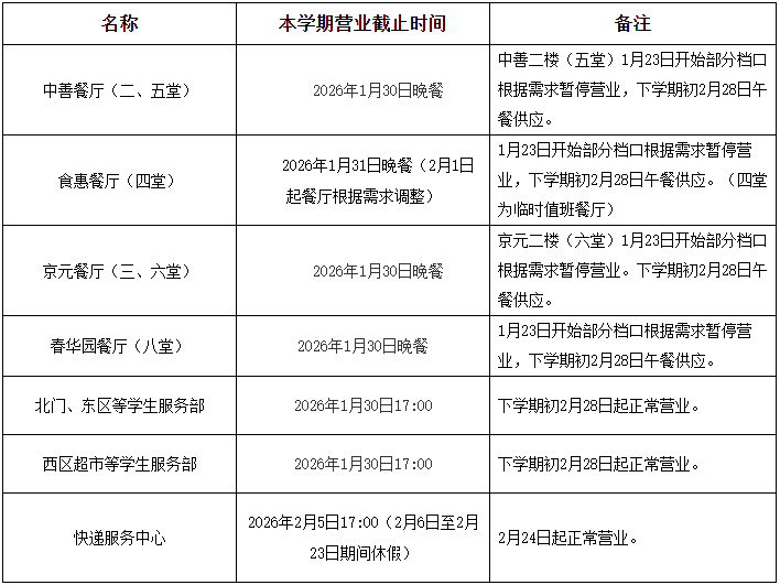 根据学院2026年寒假有关工作事项安排,现将2026年寒假期间学院各餐厅和超市截止营业时间及楼宇封楼、开楼时间安排如下: